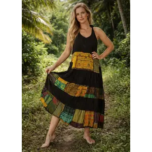 De jurk is gemaakt van allemaal kleine lapjes stof. De vrouwen van een bergstam in het noorden van Thailand hebben deze jurken voor ons gemaakt. Omdat de jurk uit veel kleine lapjes stof bestaat is elke jurk uniek.