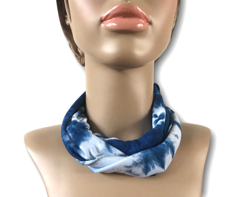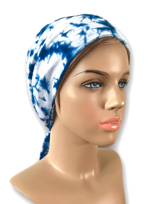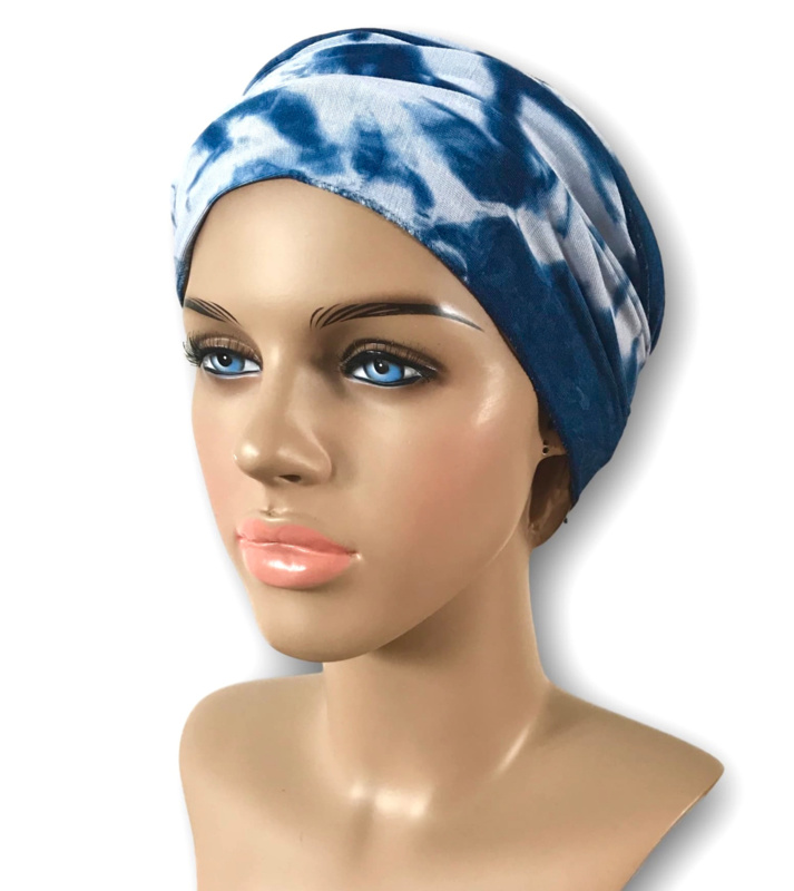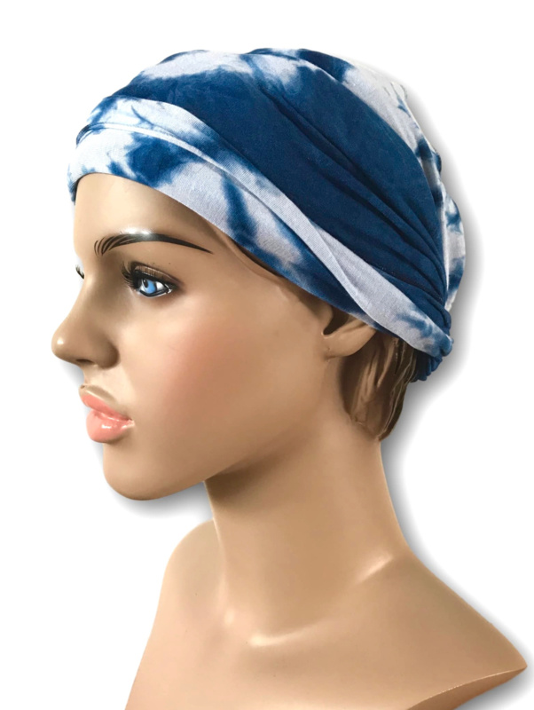 De indigo bandana is een stretchband die je op verschillende manieren om je hoofd kunt dragen.