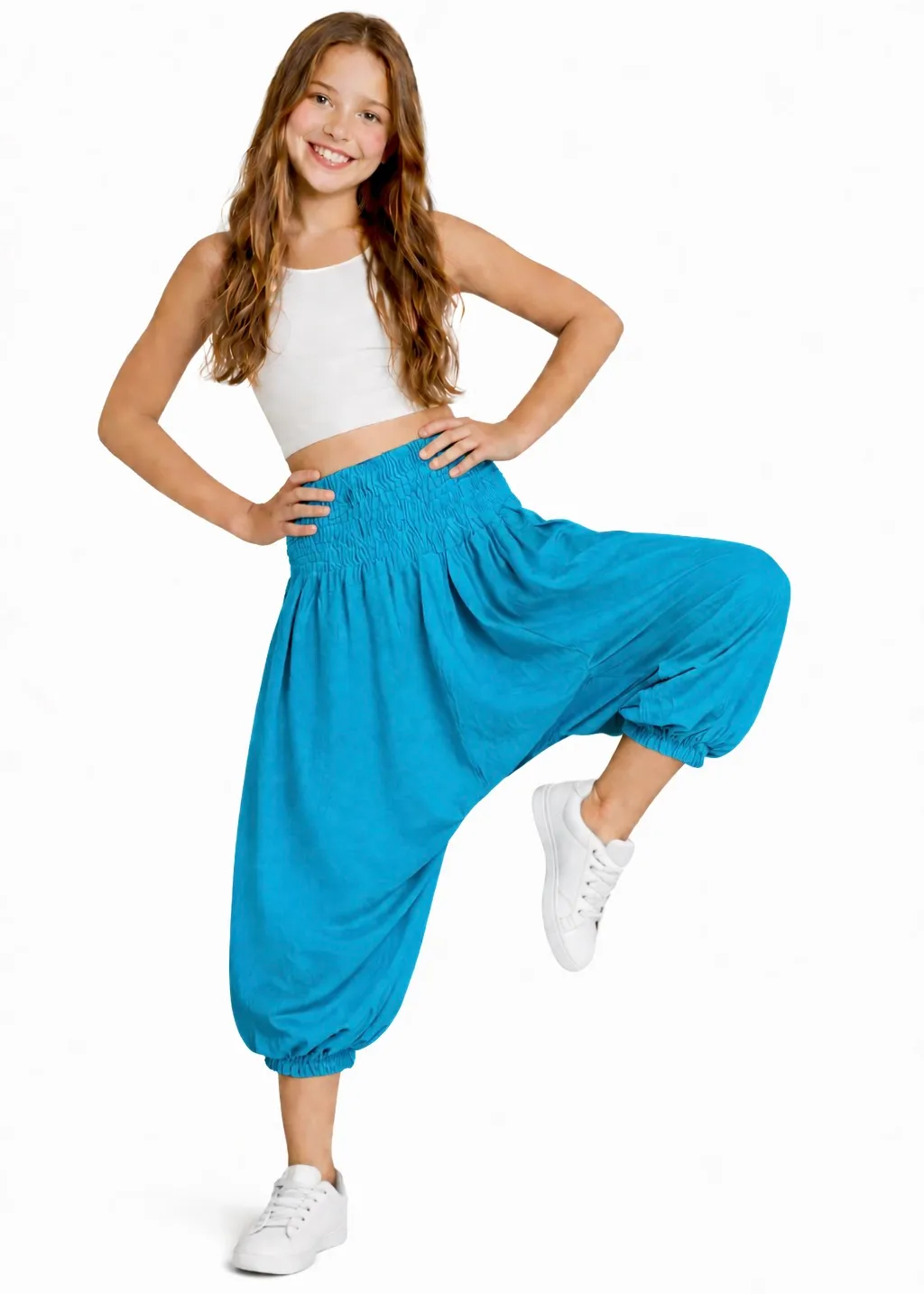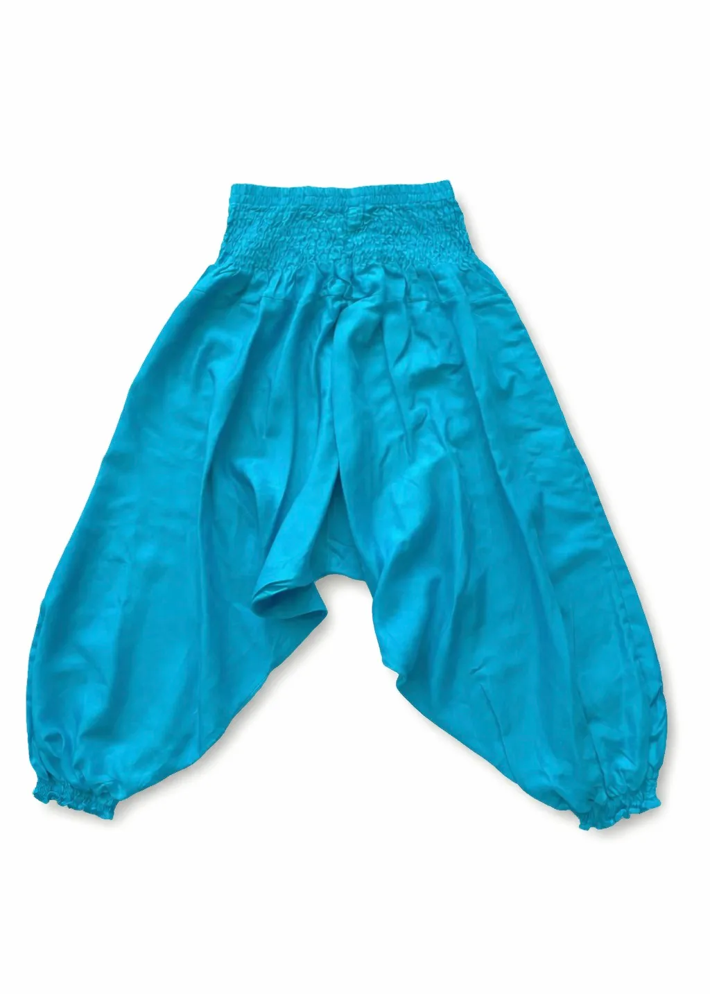 Deze aqua blauwe harembroek is lekker dun en gemaakt van soepele rayon. De lichte stof voelt zacht aan en is perfect voor warme dagen of om lekker in te bewegen. De brede elastische tailleband zorgt voor extra comfort en een fijne pasvorm zonder knellen. Dankzij het lage kruis en de elastische boorden is dit een echte meegroeibroek: eerst valt hij lang, later speels op de kuit. Geschikt voor meisjes en jongens in maat 128 t/m 146, ongeveer 8 tot 11 jaar.