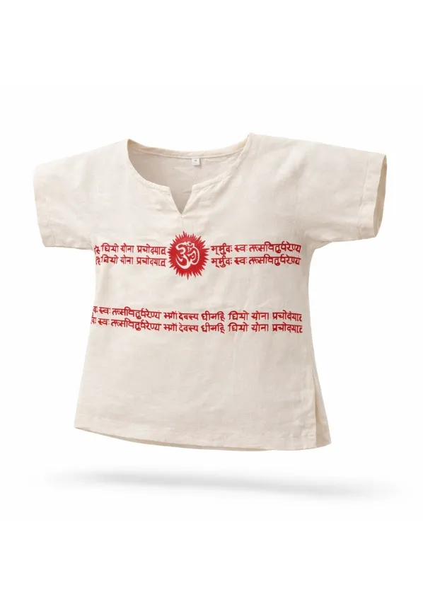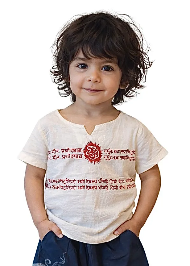 Dit off-white kinder shirt met subtiele Ohm print is perfect voor kids die zich vrij willen bewegen en hun eigen stijl hebben. Gemaakt van zacht en comfortabel katoen, ideaal voor spelen, ontspannen of op vakantie. De spirituele Ohm print geeft het shirt een unieke, alternatieve uitstraling zonder te overheersen. Combineer dit shirt moeiteloos met een harembroekje of shorts voor een complete, relaxte look. Geschikt voor jongens en meisjes die houden van comfortabele en bijzondere kinderkleding.
