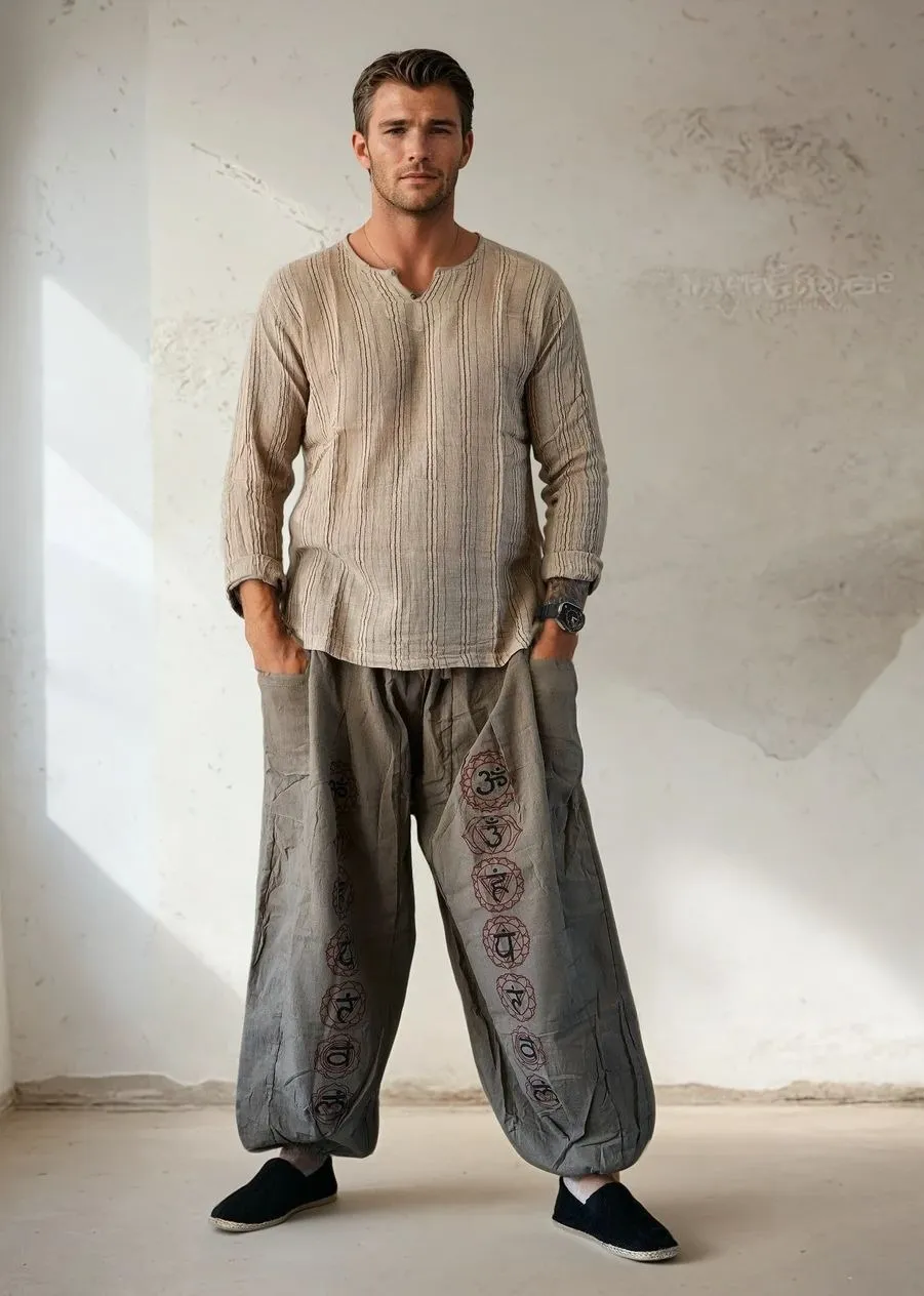 De broek is gemaakt van ademende, lichtgewicht katoen die soepel valt en zorgt voor optimale bewegingsvrijheid. De brede elastische tailleband en het elastiek rond de enkels geven de broek een stoere, nonchalante look terwijl ze zorgen voor een perfecte pasvorm, ongeacht je lichaamsvorm of maat. Dankzij het uniseks ontwerp is deze pofbroek geschikt voor iedereen die houdt van comfort met een spirituele twist.