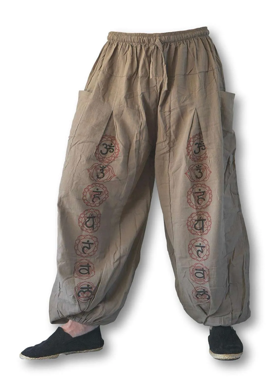 Ervaar ultiem comfort en spirituele stijl met deze prachtige uniseks pofbroek in een rustgevende taupe kleur, bedrukt met de zeven chakra-symbolen. Deze unieke broek is ontworpen voor zowel dames als heren en combineert moeiteloos een relaxte pasvorm met een betekenisvolle uitstraling.