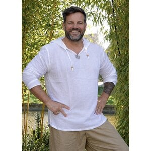Super chille hoodie, lekker dun, dus extra comfortabel. Met leuke houten accenten aan de koordjes en een capuchon.