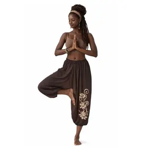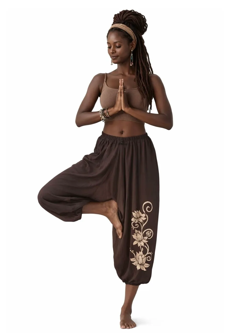 Super relaxte bruine yoga harembroek, gemaakt van heerlijke soepele rayon. Voor veel bewegingsvrijheid. Met een mooie lotus opdruk. gemaakt van voortreffelijk soepele rayon. Voor veel bewegingsvrijheid. Met een mooie lotus opdruk.